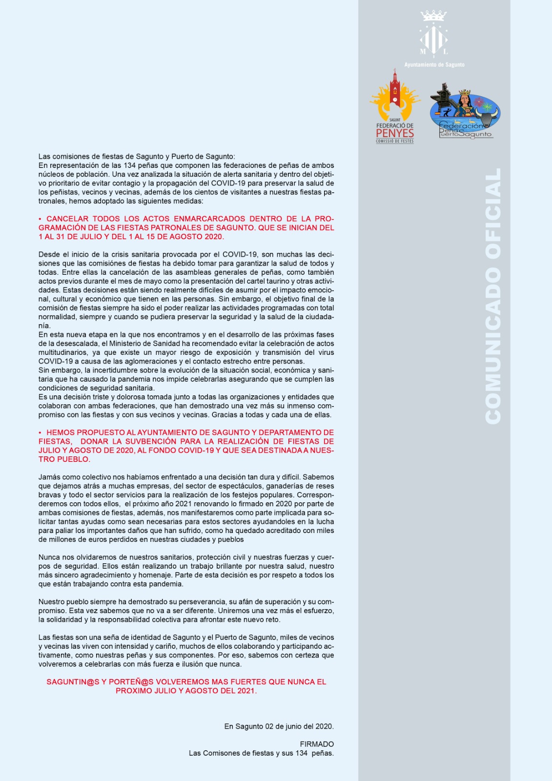 CANCELACIÓN Fiestas Patronales Pto. Sagunto 2020 – COMUNICADO OFICIAL